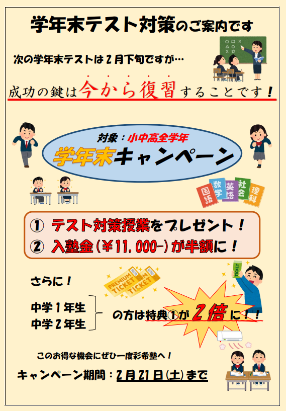 彩希塾より【学年末テスト対策キャンペーン】のご案内です。